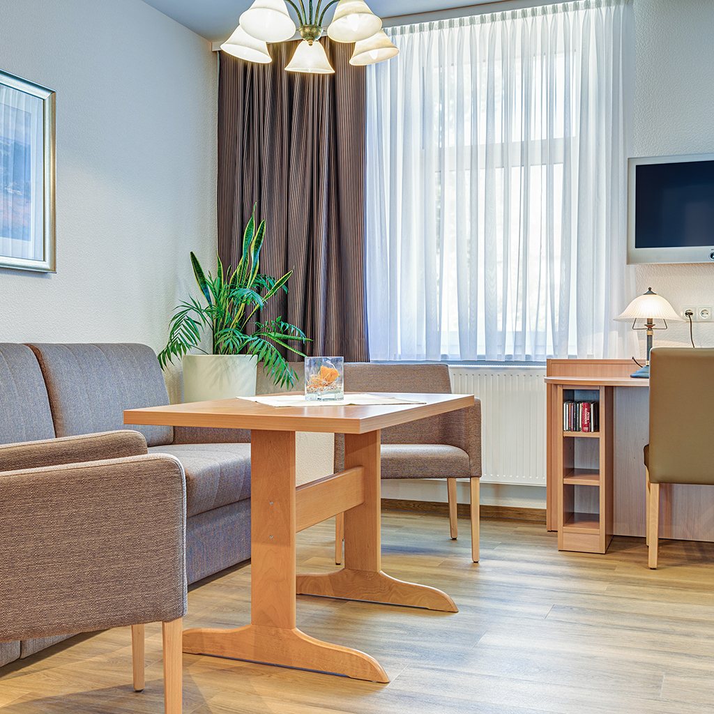 Sie betreten das im Erdgeschoss gelegene Ferienapartment über einen eigenen Eingangsbereich. Es ist circa 30 m² groß und verfügt über einen gemütlichen Wohn- und Essbereich, eine Schlafecke mit Doppelbett, eine voll ausgestattete Küchenzeile (mit Kühlschrank, 2-Platten-Herd, Mikrowelle, Kaffeemaschine, Wasserkocher, Küchenutensilien) sowie ein Badezimmer mit Dusche. Eine Aufbettung für eine Person ist im Wohnbereich mit der Schlafcouch möglich.